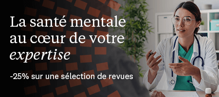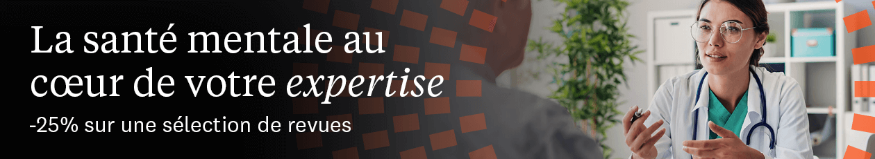 *Offre valable du 10 octobre au 22 octobre 2025 inclus, sur tous les formats et toutes les durées d’abonnement, uniquement pour les nouveaux abonnements particuliers (hors étudiants, hors institutions). Offre valable sur une sélection de revue lié à la santé mentale. Non applicable aux eBooks, livres et solutions ClinicalKey Now.